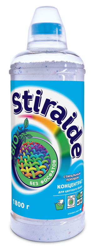 Концентрированный бесфосфатный стиральный порошок «Stiraide» имеет отличные моющие характеристики. Предназначен для стирки белых изделий из хлопчатобумажных, льняных, синтетических тканей и тканей из смешанных волокон, кроме шерсти и шёлка. Применяется для машинной и ручной стирки в воде любой жёсткости. Имеет деликатный аромат, надолго сохраняет свежесть белья, заботится о ткани. Благодаря наличию энзимов (биологически активных веществ) удаляет стойкие загрязнения (пятна от травы, пота, крови, вина и жира), не повреждая структуру ткани.
