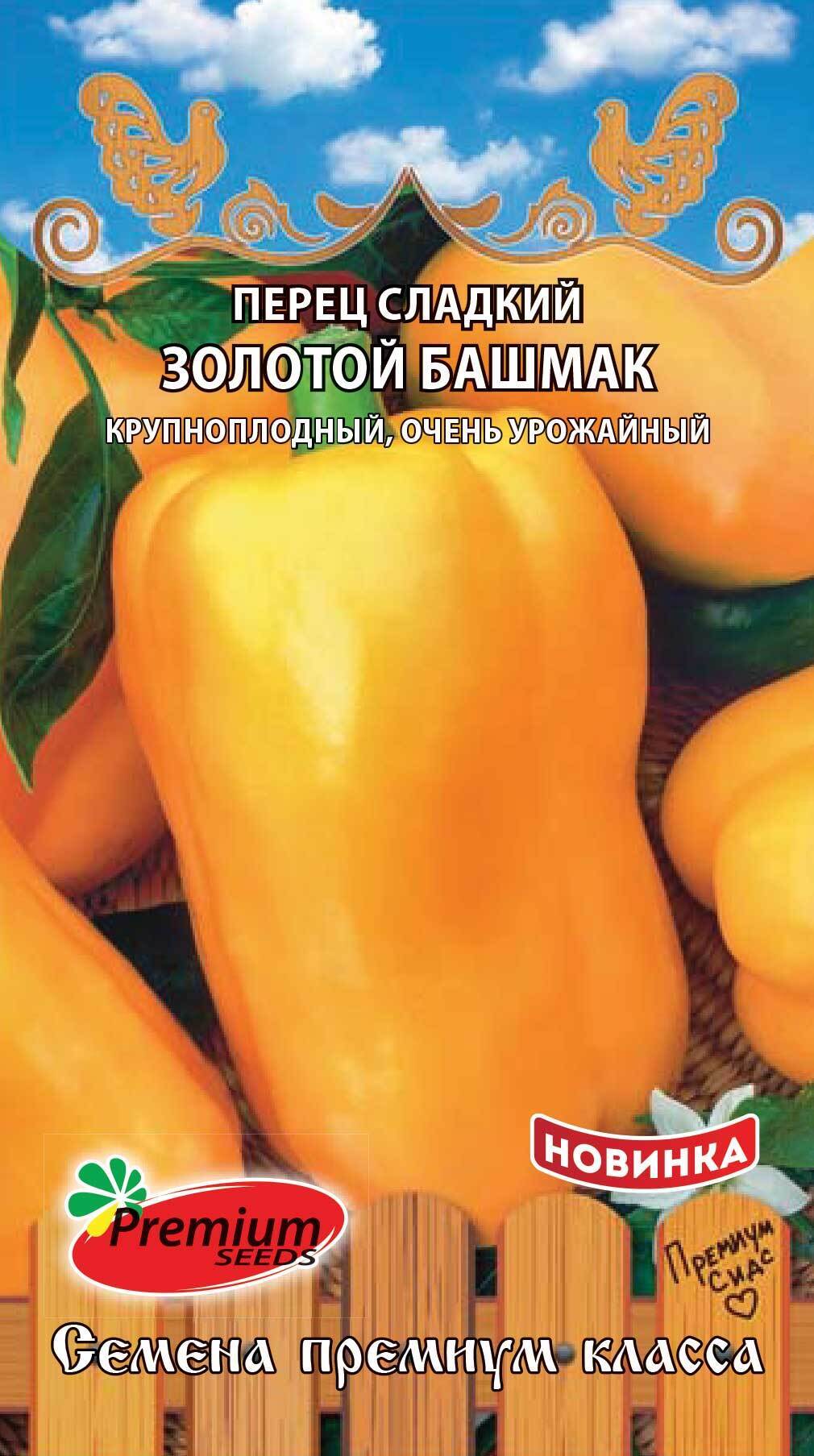 Всем невзгодам вопреки зреют чудо башмаки! Золотой башмак сорвешь-зиму вкусно проживешь! Среднеспелый (115-125 дней от полных всходов до начала созревания), крупноплодный сорт. Растение высотой 80-85 см, требует подвязки. Плоды кубовидно- цилиндрические, массой 250-280г, в фазе технической спелости светло–зелёные, в биологической жёлто–оранжевые, толстостенные 6-8мм. Мякоть мясистая, сочная с сильным перечным ароматом. Урожайность 5-6 кг/м2. Устойчив к вертициллёзному увяданию.